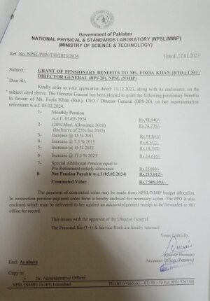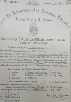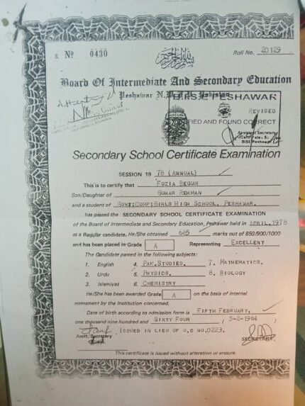 According to documents, Ms. Begum allegedly manipulated her date of birth by presenting two different matriculation certificates issued by the Board of Intermediate and Secondary Education, Peshawar,  a move that reportedly extended her service by three years, allowing her rapid promotions and significant financial benefits (Ref: NPSL/Pen/130/2023/2024, dated 17/01/2023).