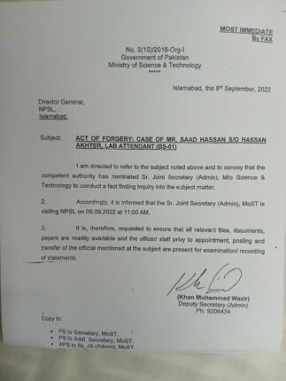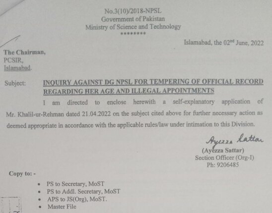 An internal inquiry (Vide MoST O.M. 3(10)/2018-NPSL, dated 15-09-2022), led by former Senior Joint Secretary Mr. Hassan Ali Khan Laghari, revealed that against 42 sanctioned posts, the department illegally recruited 66 employees, in violation of government rules.